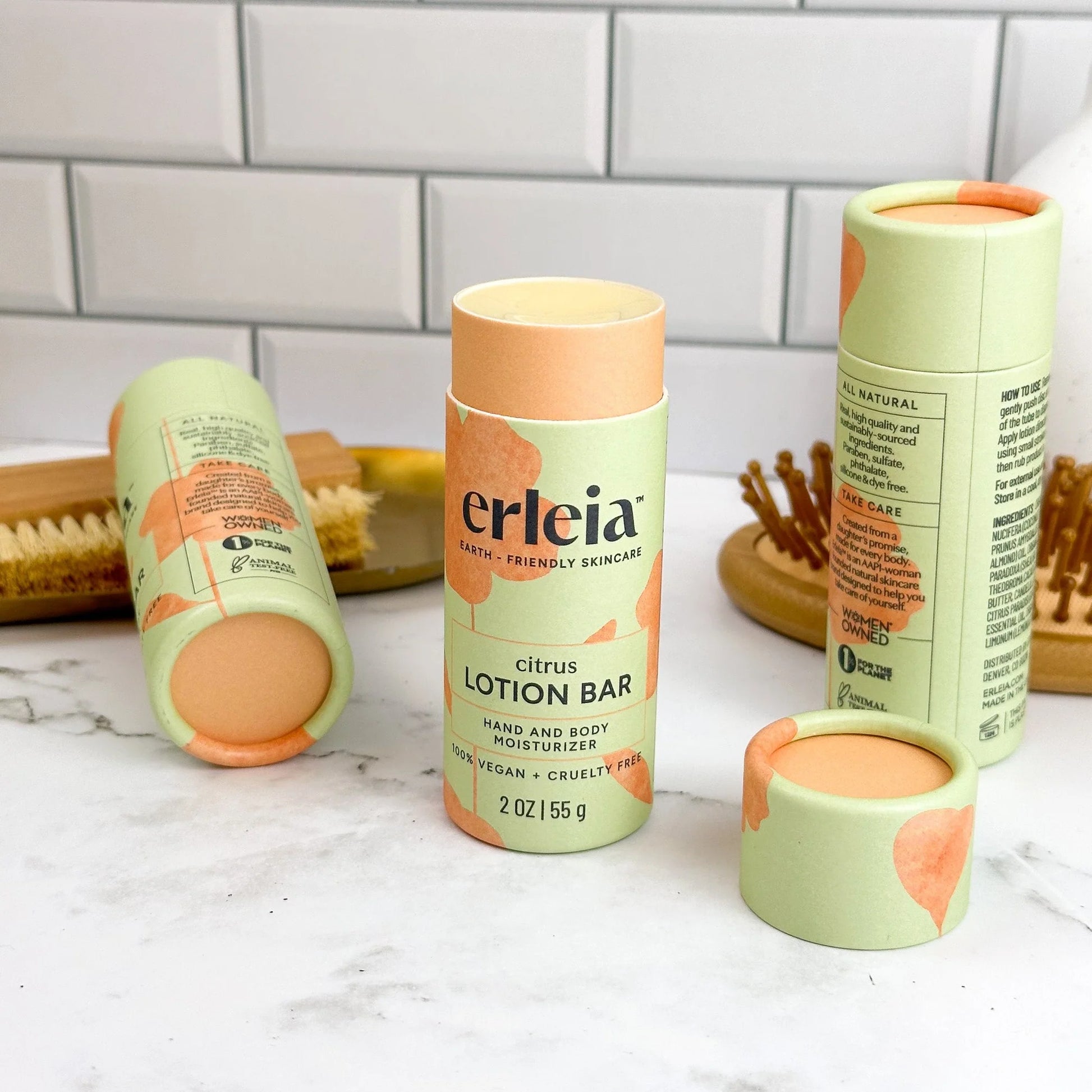 Our Lotion Bar comes in a sturdy, plastic-free push up paper tube. Gently press on the bottom disc to dispense product as needed.