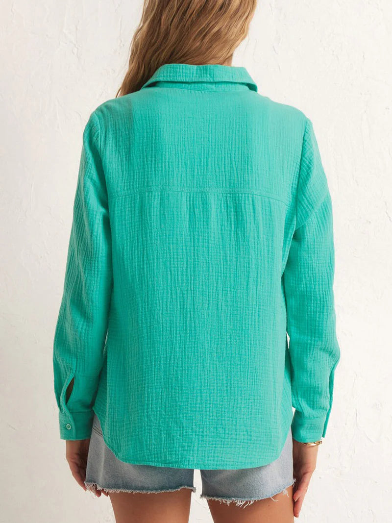 Meet the dressier side of gauze. This button up gauze top can be worn day to night, and features a relaxed fit with front pockets.